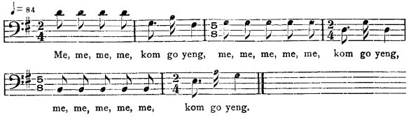 So them well pleased of it, father an' mother, an' them marry, Snake an' daughter. An' when the wedding-day come, everything was well finish until getting home now at the husband house in a wil' wood. An' when he got half way, begun to drop the clo'es now that he wear, drop him trousers, drop him shirt, an' jacket, an' going into one hole an' long out his head. An' he lay hol' of the leg of his wife an' he swallow to the hip an' he couldn't go further.' Yellow Snake begin to sing,