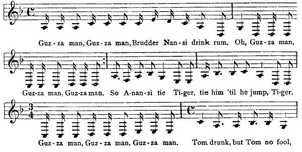 Guz-za man, Guz-za man, Brudder Nan-si drink rum. Oh, Guz-za man,
