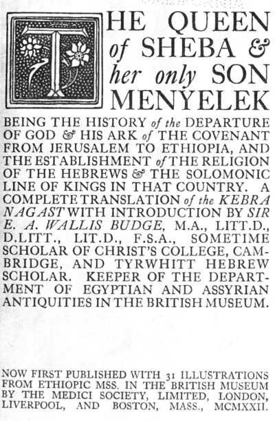 BEING THE HISTORY of the DEPARTURE OF GOD & HIS ARK of THE COVENANT FROM JERUSALEM TO ETHIOPIA, AND THE ESTABLISHMENT of THE RELIGION OF THE HEBREWS & THE SOLOMONIC LINE OF KINGS IN THAT COUNTRY. A COMPLETE TRANSLATION of the KEBRA NAGAST WITH INTRODUCTION BY SIR E. A. WALLIS BUDGE, M.A., LITT.D., D.LITT., LIT.D., F.S.A., SOMETIME SCHOLAR OF CHRIST'S COLLEGE, CAMBRIDGE, AND TYRWHITT HEBREW SCHOLAR. KEEPER OF THE DEPARTMENT OF EGYPTIAN AND ASSYRIAN ANTIQUITIES IN THE BRITISH MUSEUM.