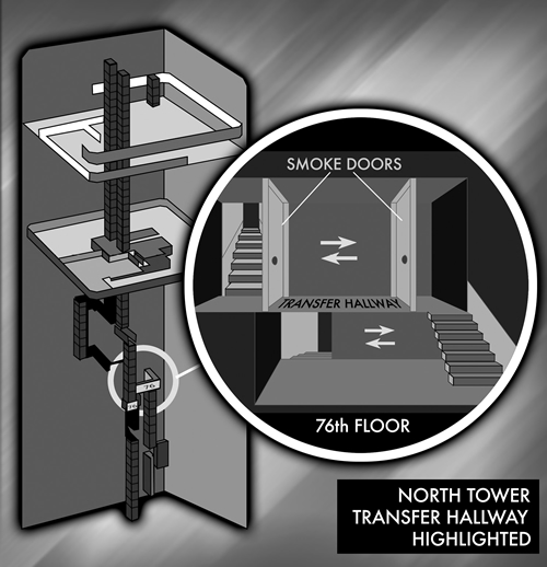 floor below the mezzanine. All three stairwells ran essentially straight up and down, except for two deviations in stairwells A and C where the staircase jutted out toward the perimeter of the building. On the upper and lower boundaries of these deviations were transfer hallways contained within the stairwell proper. Each hallway contained smoke doors to prevent smoke from rising from lower to upper portions of the building; they were kept closed but not locked. Doors leading from tenant space into the stairwells were never kept locked; reentry from the stairwells was generally possible on at least every fourth floor.3