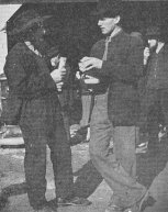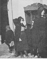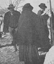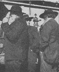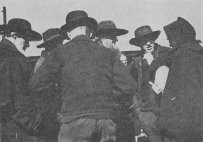 All Together . . . Broad-brimmed hats, full-grown whiskers, heavy sweaters, a great-coat or two, and a bonnet. We don't know what she might be saying, but her audience is giving her all possible attention. (Lower left)