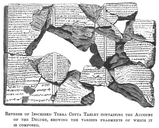 Some idea of the mutilated condition of the Assyrian tablets, and of the work of restoring a single text, will be gained from the engraving below, which exhibits the present appearance of one of the Deluge tablets. In this tablet there are sixteen fragments.