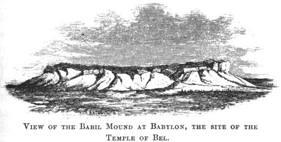 have been devoted to the planet Saturn. The second stage was a square of 230 feet, 26 feet high, faced with orange-coloured bricks; supposed to be devoted to Jupiter. The third stage, 188 feet square, and 26 feet high, faced with red bricks, was probably dedicated to Mars. The fourth stage, 146 feet square, and 15 feet high, was probably devoted to the Sun, and is supposed by Sir H. Rawlinson to have been originally plated with gold. The fifth stage is supposed to have been 104, the sixth 62, and the seventh 20 feet square, but the top was too ruinous to decide these measurements. These stages were probably devoted to Venus, Mercury, and the Moon. Each stage of the building was not set in the centre of the stage on which it rested, but was placed 30 feet from the front, and 12 feet from the back. The ruin at present rises 154 feet above the level of the plain, and is the most imposing pile in the whole country. The only other ruin which has any claim to represent the tower is the Babil mound within the enclosure of Babylon, which is the site of the Temple of Bel. I have given views of both ruins as the possible alternative sites.
