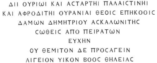'To Zeus, sender of fair winds, and Astarte of Palestine, and Aphrodite Urania, to the divinities that hearken, Damon son of Demetrios of Ashkelon, saved from pirates, makes this vow. It is not lawful to offer in sacrifice an animal of the goat or pig species, or a cow.' 3