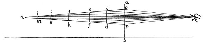 as shown in the example given above. Now, let a b be the said vertical plane and r the point of the pyramid terminating in the eye, and n the point of diminution which is always in a straight line opposite the eye and always moves as the eye moves--just as when a rod is moved its shadow moves, and moves with it, precisely as the shadow moves with a body. And each point is the apex of a pyramid, all having a common base with the intervening vertical plane. But although their bases are equal their angles are not equal, because the diminishing point is the termination of a smaller angle than that of the eye. If you ask me: "By what practical experience can you show me these points?" I reply--so far as concerns the diminishing point which moves with you --when you walk by a ploughed field look at the straight furrows which come down with their ends to the path where you are walking, and you will see that each pair of furrows will look as though they tried to get nearer and meet at the [farther] end.