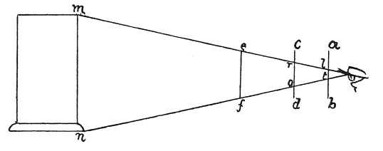 How to measure the pyramid of vision.As regards the point in the eye; it is made more intelligible by this: If you look into the eye of another person you will see your own image. Now imagine 2 lines starting from your ears and going to the ears of that image which you see in the other man's eye; you will understand that these lines converge in such a way that they would meet in a point a little way beyond your own image mirrored in the eye. And if you want to measure the diminution of the pyramid in the air which occupies the space between the object seen and the eye, you must do it according to the diagram figured below. Let m n be a tower, and e f a, rod, which you must move backwards and forwards till its ends correspond with those of the tower 32 ; then bring it nearer to the eye, at c d and you