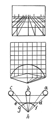 every portion of it, influenced by natural perspective and artificial perspective. By natural perspective I mean that the plane on which this perspective is represented is a flat surface, and this plane, although it is parallel both in length and height, is forced to diminish in its remoter parts more than in its nearer ones. And this is proved by the first of what has been said above, and its diminution is natural. But artificial perspective, that is that which is devised by art, does the contrary; for objects equal in size increase on the plane where it is foreshortened in proportion as the eye is more natural and nearer to the plane, and as the part of the plane on which it is figured is farther from the eye.