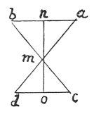 by his image. Let n o be the mirror, b the eye of your friend and d your own eye. Your friend's eye will appear to you at a, and to him it will seem that yours is at c, and the intersection of the visual rays will occur at m, so that either of you touching m will touch the eye of the other man which shall be open. And if you touch the eye of the other man in the mirror it will seem to him that you are touching your own.