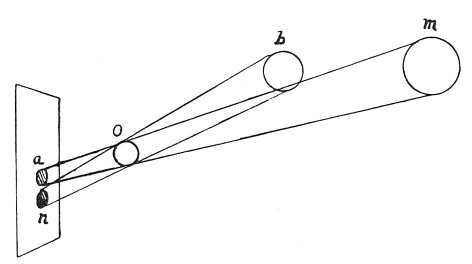 120:105 : The diagram originally placed between lines 3 and 4 is on Pl. VI, No. 3. In the diagram given above line 14 of the original, and here printed in the text, the words corpo luminoso [luminous body] are written in the circle m, luminoso in the circle b and ombroso [body in shadow] in the circle o.