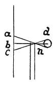 The edges of an object placed in front of the pupil of the eye will be less distinct in proportion as they are closer to the eye. This is shown by the edge of the object n placed in front of the pupil d; in looking at this edge the pupil also sees all the space a c which is beyond the edge; and the images the eye receives from that space are mingled with the images of the edge, so that one image confuses the other, and this confusion hinders the pupil from distinguishing the edge.