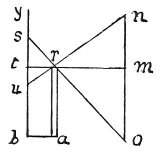 each other. To prove this let r be one of the sides of the hole, opposite to which let s be the eye which sees the lower end o of the line n o. The other extremity cannot transmit its image to the eye s as it has to strike the end r and it is the same with regard to m at the middle of the line. The case is the same with the upper extremity n and the eye u. And if the end n is red the eye u on that side of the holes will not see the green colour of o, but only the red of n according to the 7th of this where it is said: Every form projects images from itself by the shortest line, which necessarily is a straight line, &c