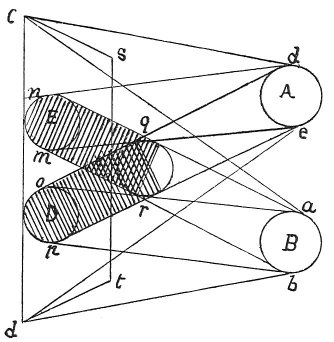 d e; but, as the red light a b cannot fall there, n m will appear as a blue shadow on a red background tinted with blue, because on the surface s c t d both lights can fall. But in the shadows only one single light falls; for this reason these shadows are of medium depth, since, if no light whatever mingled with the shadow, it would be of the first degree of darkness &c But in the shadow at o p the blue light does not fall, because the body q r interposes and intercepts it there. Only the red light a b falls there and tinges the shadow of a red hue and so a ruddy shadow appears on the background of mingled red and blue.