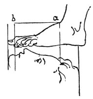 Relative proportions of the foot and of the face (325--327).The foot, from where it is attached to the leg, to the tip of the great toe is as long as the space between the upper part of the chin and the roots of the hair a b; and equal to five sixths of the face.