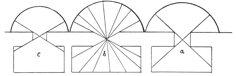 256:243 : From a reference to the notes on the right light for painting it becomes evident that the observations made on cellar-windows have a direct bearing on the construction of the studio-window. In the diagram b as well as in that under No. 510 the window-opening is reduced to a minimum, but only, it would seem, in order to emphasize the advantage of walls constructed on the plan there shown.