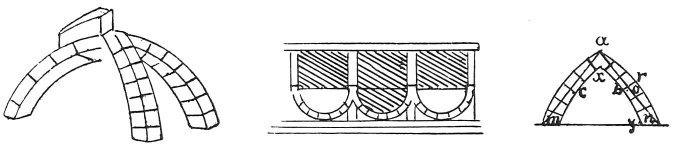 The arch will not break if the chord of the outer arch does not touch the inner arch. This is manifest by experience, because whenever the chord a o n of the outer arch n r a approaches the inner arch x b y the arch will be weak, and it will be weaker in proportion as the inner arch passes beyond that chord. When an arch is loaded only on one side the thrust will press on the top of the other side and be transmitted