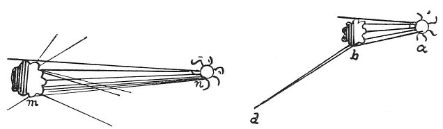 crests of the waves than from any other part, as is shown by the form of the moon, whose rays a strike the waves b and are reflected in the line b d, the eye being situated at d. This cannot happen at the full moon, when the solar rays, being in the west, fall on the extreme waters of the moon to the East from n to m, and are not reflected to the eye in the West, but are thrown back eastwards, with but slight deflection from the straight course of the solar ray; and thus the angle of incidence is very wide indeed.The moon is an opaque and solid body and if, on the contrary, it were transparent, it would not receive the light of the sun.