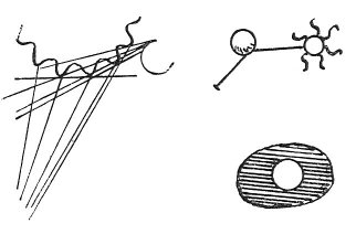 The moon has no light in itself; but so much of it as faces the sun is illuminated, and of that illumined portion we see so much as faces the earth. And the moon's night receives just as much light as is lent it by our waters as they reflect the image of the sun, which is mirrored in all those waters which are on the side towards the sun. The outside or surface of the waters forming the seas of the moon and of the seas of our globe is always ruffled little or much, or more or less--and this roughness causes an extension of the numberless images of the sun which are repeated in the ridges and hollows, the sides and fronts of the innumerable waves; that is to say in as many different spots on each wave as our eyes find different positions to view them from. This could not happen, if the aqueous sphere which covers a great part of the moon were uniformly spherical, for then the images of the sun would be one to each spectator, and its reflections would be separate and independent and its radiance would always appear circular; as is plainly to be seen in the gilt balls placed on the tops of high buildings. But if those gilt balls were rugged or composed of several little balls, like mulberries, which are a black fruit composed of minute round globules, then each portion of these little balls, when seen in the sun, would display to the eye the lustre resulting from the reflection of the sun, and thus, in one and the same body many tiny suns would be seen; and these often combine at a long distance and appear as one. The lustre of the new moon is brighter and stronger, than when the moon is full; and the reason of this is that the angle of incidence is more obtuse in the new than in the full moon, in which the angles [of incidence and reflection] are highly acute. The waves of the moon therefore mirror the sun in the hollows of the waves as well as on the ridges, and the sides remain in shadow. But at the sides