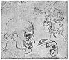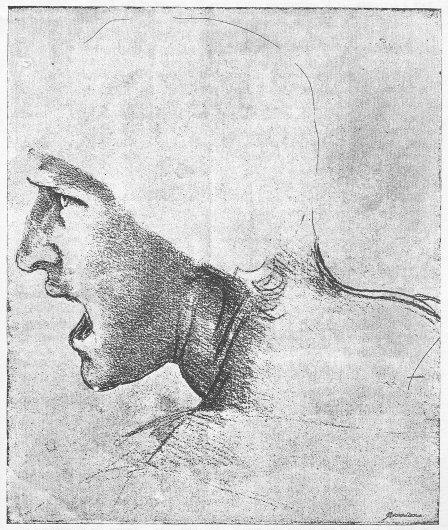 Leonardo's two drawings, preserved in the museum at Buda-Pesth and reproduced on pages 338 and 339 are preliminary studies for the heads of fighting warriors. The two heads drawn in black chalk (pg. 338) and the one seen in profile, turned to the left, drawn in red chalk (pg. 339), correspond exactly with those of two horsemen in the scene of the fight round the standard as we see them in Madame Timbal's picture and in the other finished copies. An old copy of the last named drawing by a pupil of Leonardo is in MS. C. A. 187b; 561b (See Saggio, Tav. XXII). Leonardo used to make such finished studies of heads as those, drawn on detached sheets, before beginning his pictures from his drawings--compare the preparatory studies for the fresco of the Last Supper, given on Pl. XLVII and Pl. L. Other drawings of heads, all characterised by the expression of vehement excitement that is appropriate to men fighting, are to be seen at Windsor (No. 44) and at the Accademia at Venice (IV, 13); at the back of one of the drawings at Buda-Pesth there is the bust of a warrior carrying a spear on his left shoulder, holding up the left arm (See Csatakepek a XVI--lk Szazadbol osszeallitotta Pvlszky Karoly). These drawings may have been made for other portions of the cartoon, of which no copies exist, and thus we are unable to identify these preparatory drawings. Finally I may add that a sketch of fighting horse and foot soldiers, formerly in the possession of M. Thiers and published by Charles Blanc in his "Vies des Peintres" can hardly be accepted as genuine. It is not to be found, as I am informed, among the late President's property, and no one appears to know where it now is.