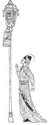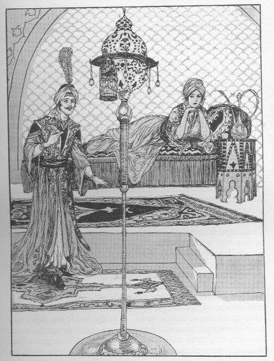 is nothing to worry about. It is as easy as can be. Go this evening to the serai, and take me with you. The Sultana wears seven veils; no one has ever seen her face, and she sees no one. Put me in my cage under the lamp-stand, and ask the Sultana how she is. She will vouchsafe no answer, however. Then say that as she will not condescend to speak you will converse with the lamp-stand. So begin to speak, and I will reply."