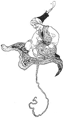 Putting the turban on his head, the young man rose and followed her. As he came outside he saw before him an Arab, on whose head rested a golden basin, and in this bowl sat the Princess. The prodigal immediately sprang into the basin, nearly upsetting it as he did so. The Arab, astonished, asked the maiden what she was doing, for he had nearly dropped her. "I have not moved a