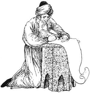 His wife being of exceptional beauty he did not like the thought of losing her, so he began to consider whether anything could be done. He went to a coffeehouse, and while he was absorbed in thought over the difficulty a friend came up and asked what was the matter. Our man related his trouble. Now the friend was intimate with the bath-woman, and he answered: "Be consoled, brother, I will help thee." With these words he went straight to the bath-woman and put the situation clearly before her. The woman rejoined: "Tomorrow let the man post himself at the gate of the bath, armed with paper, pen, and inkpot, and scribble away like a soothsayer. The rest shall be my affair."
