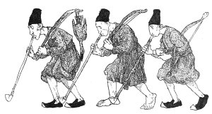 On and on we went, until we came to three houses, two of which were in ruins, while the third had no foundation. There lay three men, two dead and one without life. We asked the dead men to give us a vessel to cook our duck in. They showed us three cupboards, two of which were broken and the third had no sides. In them we found three plates, two full of holes and the third without bottom. In the plate with out bottom we cooked the duck. One of us said, "I have eaten sufficient;" the other, "I've no appetite," and I said, "No more, thank you." He who said he had eaten sufficient ate up