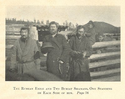 THE RUSSIAN EXILE AND TWO BURIAT SHAMANS, ONE STANDING ON EACH SIDE OF HIM.