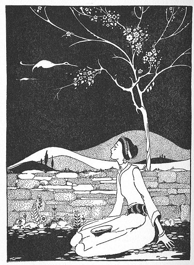 ONE DAY A BIG CRANE FLYING OVER THE PALACE, CARRYING A FEW HEADS OF RICE FOR HIS OWN FOOD, DROPPED SOME GRAINS INTO THE PALACE GARDEN.