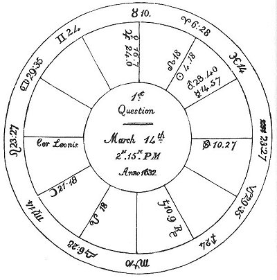 Although it is not usual to be so inquisitive, yet, seeing the figure so radical, I considered from what planets ☉, lord of the ascendant, had last separated. The ☉ had lately been in ☌ ♂, then ☐ ♄, then ✶ ♃. Now as ♂ is lord of the 4th house, signifying lands, &c., and was now in the 8th, which signifies the substance of women, I judged he had been molested of late concerning some lands, or the jointure or portion of his wife, or a woman; wherein I was confirmed the more, as ☽ applies to ☍ ♂ in the 8th house; she being in the querent's house of property, which sheaved that the quarrel or strife should be concerning money or things signified by that house. (All this was very true.)
