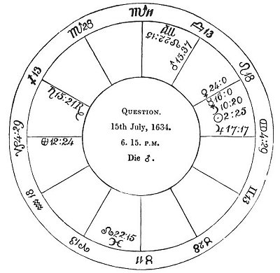 [paragraph continues] ♀ in her 2d, and also that ☽ separated from ☉, and transferring his light to ♄, lord of the ascendant and 2d and ⊕, I assured the querent that he had no cause to fear the nonpayment of his wife's portion; that all promised would be paid; and that, to his farther comfort, she would prove a chaste and virtuous woman, but somewhat proud. I have since heard, from his own mouth, that this judgment proved exactly true.