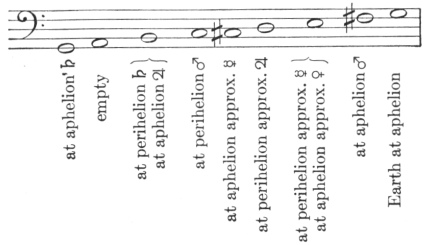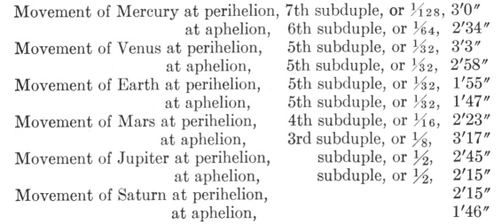 Now the aphelial movement of Saturn at its slowest—i.e., the slowest movement—marks G, the lowest pitch in the system with the number 1´46″. Therefore the aphelial movement of the Earth will mark the same pitch, but five octaves higher, because its number is 1´47″, and who wants to quarrel about one second in the aphelial movement of Saturn? But let us take it into account, nevertheless; the difference will not be greater than 106 : 107, which is less than a comma. If you add 27″, one quarter of this 1´47″, the sum will be 2´14″, although the perihelial movement of Saturn has 2´15″; similarly the aphelial movement of Jupiter, but one octave higher. Accordingly, these two movements mark the note b, or else are very slightly higher. Take 36″, one third of 1´47″, and add it to the whole; you will get as a sum 2´23″ for the note c; and here's the perihelion of Mars of the same magnitude but four octaves higher. To this same 1´47″ add also 54″, half of it, and the sum will be 2´41″ for the note d; and here the perihelion of Jupiter is at hand, but one octave higher, for it occupies the nearest number, viz., 2´45″. If you add two thirds, viz., 1´11″, the sum will be 2´58″; and here's the aphelion of Venus at 2´58″. Accordingly, it will mark the pitch or the note e, but five octaves higher. And the perihelial movement of Mercury, which is 3´0″, does not exceed it by much but is seven octaves higher. Finally, divide the double of 1´47″, viz., 3´34″, into nine parts and subtract one part of 24″ from the whole; 3´10″ will be left for the note f, which the 3´17″ of the aphelial movement of Mars marks approximately but three octaves higher; and this number is slightly greater than the just number and approaches the note f sharp. For if one sixteenth of 3´34″, viz., 13½″, is subtracted from 3´34″, then 3´20½″ is left, to which 3´17″ is very near. And indeed in music f sharp is often employed in place of f, as we can see everywhere.
