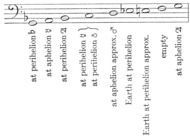 On the other hand, if the beginning of the scale is made at 2´15″, the aphelial movement of Saturn, and we must express the note G in those degrees: then for the note A is 2´32″, which closely approaches the aphelial movement of Mercury; for the note b flat, 2´42″, which is approximately the perihelial movement of Jupiter, by the equipollence of octaves; for the note c, 3´0″, approximately the perihelial movement of Mercury and Venus; for the note d, 3´23″ and the aphelial movement of Mars is not much graver, viz., 3´17″, so that here the number is about as much less than its note as previously the same number was greater than its note; for the note e flat, 3´36″, which the aphelial movement of the Earth approximates; for the note e, 3´50″, and the perihelial movement of the Earth is 3´49″; but the aphelial movement of Jupiter again occupies g. In this way, all the notes except f are expressed within one octave of the minor scale by most of the aphelial and perihelial movements of the planets, especially by those which were previously omitted, as you see in the table.