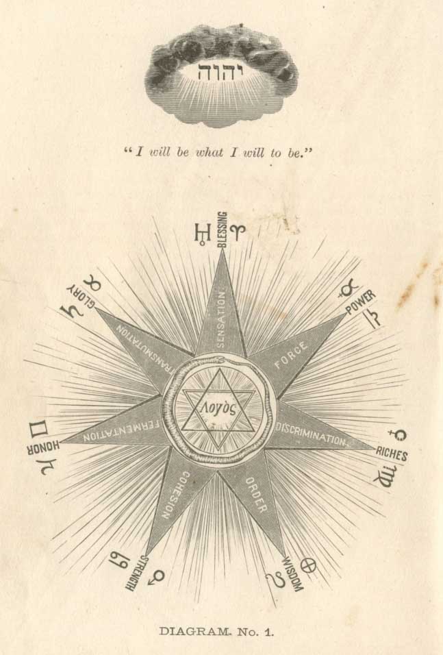 This Diagram is a formula expressing the creative energies of the Word, or Logos, the Greek of which is given in the centre of the star. The double triangle expresses the dual relation of the creative forces,—as male and female,—the ancient term of expression being theos-sophy. Their triune expression is, first, Spirit; second, Body; third, Soul. The seven points of the star are expressive of the seven primate creative principles, as named on the respective points; and when man conquers or subjugates these principles to the higher will within himself, he then attains the ultimates which stand expressed against the seven points. These seven creative principles are found to have their solar expression in the seven planets made use of in this system, and the different planetary signs are placed against their appropriate point, or principle, in juxtaposition to the sign of the zodiac in which they find their most natural or perfect expression. These seven points are called the seven vital principles. The body of man, being an epitome of the solar man, or nature, cannot exist without having these seven principles in working order, while he can live without the five serving principles provided he be served by others. The serpent encompassing the triangles is expressive of the circle of eternity, also of the psychic or sex principles of nature, which is active in the work of creation or generation.