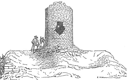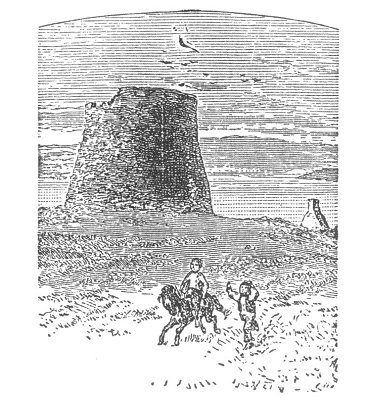 [paragraph continues] Northmen." I give above a picture of the Burgh or Broch of the little island of Moussa, in the Shetlands. It is circular in form, forty-one feet in height, open at the top; the central