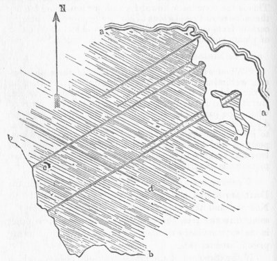 We have seen that the surface-rocks underneath the Drift are scored and grooved by some external force. Now we find that these markings do not all run in the same direction; on the contrary, they cross each other in an extraordinary manner. The cut on the following page illustrates this.
