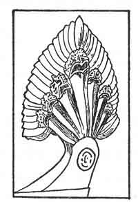 . Bird winged Circle. Hindu.As will be seen, in all cases except one, the circles have feathered wings. All these, I believe, originated since the destruction of Mu. The Butterfly winged circle was in existence before Mu went down. The winged circle was popularly received by all people but everyone appears to have had a different conception of how it should be designed. The Egyptian designs exceeded all others in gorgeously beautiful feather work.