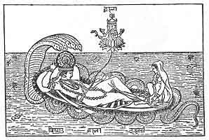The god Vishnu supported by the Serpent Ananta, having seven heads, the symbol of the Seven Commands of Creation.