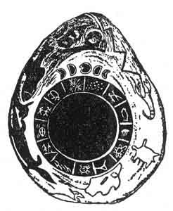 . There are various animals shown on the outer side of the stone. These I have not taken into account although two are very prominent in ancient picture writings and in Indian legends.It must be apparent that the designers of this Calendar Stone were acquainted with the Cosmic Forces and the Cosmic Sciences as taught during the First [paragraph continues]