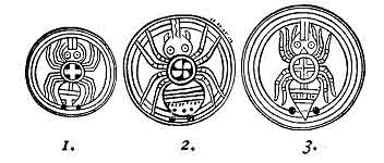 These Spiders were brought to my notice by my friend, Dr. Thomas M. Stewart, of Cincinnati, Ohio. They are engraved on circular pieces of shell, and on each of their backs is a symbol showing what they represented. These peculiar relics have been found in the burial vaults of the Mound Builders of Missouri, Arkansas and Tennessee. Because of the location of the places where they have been found Dr. Stewart suggested that they might have been used in the same manner as the Scarab in the Egyptian burial chambers.