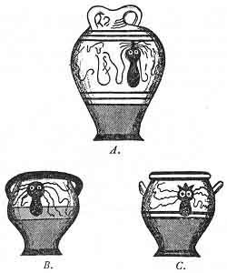 SHADOWS FROM GREECE AND ASIA MINOR.--From the ancient cities of the Grecian Archipelago and Asia Minor, which have been and are being unearthed, many pieces of pottery have been found which have the Octopus either engraved, raised or painted on them, making prominent and striking decorations. In Crete, Cyprus and Troy many fine and perfect specimens have been discovered. Fortunately, the motif designs vary considerably which gives one a fair chance to read their correct meaning, as for instance, on vases B and C in the Cyprus Group. On both the tentacles and body are intact. Here the Octopus is simply a reminder of that which it symbolizes. Vase A, from the same ruined city, shows a totally different phase. Here the Octopus