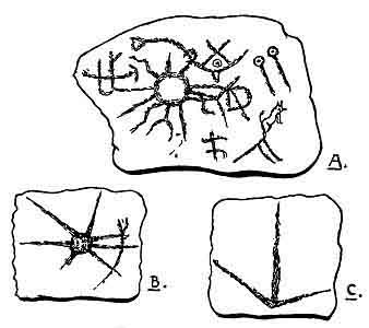 Another interesting bit of Pipestone lore is the symbolic Bird of Creation. Here at Pipestone among the Sioux legends we again find the Bird of Creation the symbol of the Creative Forces throughout the world. Catlin, in 1836, recounting his visit to the Pipestone, says: "Not far from us, in the solid rock, are the deeply impressed footprints of the Great Spirit in the form of the tracks of a Great Bird. (See Fig. C. Page 242.)