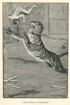 To begin with, the beasts were no fair antagonists for single men. In fact, twenty men armed might well have fled from them. When the warder said tigers, I supposed he meant the great cats of the woods. But here, in the circus, I saw a pair of the most terrific of all the fur-bearing land beasts, the great tigers of the caves—huge monsters, of such ponderous strength that in hunger they will oftentimes drag down a mammoth, if they can find him away from his herd.