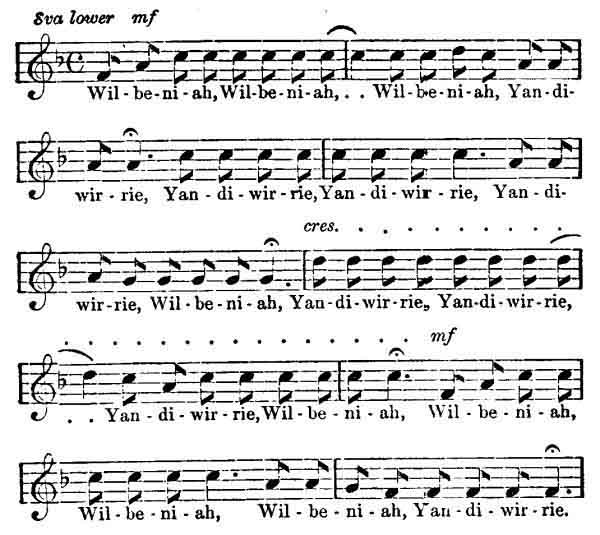 The next is a different class of song altogether, being one sung at a corroborie, or native dance. Like all native ditties, it is repeated almost ad infinitum. It may be said to be divided into two parts, the first terminating at the asterisk, and being sung very smoothly--the second, which is largely composed of what, in music, are called "accidentals," is sung in a very loud excited, staccato manner, and its effect may better be appreciated by the singer speaking the notes rather than singing them. What the words mean I was never able to learn. No inducement was potent enough to win from my black friends even the faintest hint as to the meaning of the, song. They merely laughed, and said, "nothing tell 'em." I am, therefore, unable to furnish a translation."