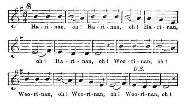 Two natives were married, and, which is not always the case, both parties were great favourites, and wonderful to relate very young. After the marriage, a party of natives, male and female, belonging to their tribe gathered round the fire in front of their hut and sang the following measure, scores of times: "Harinan"