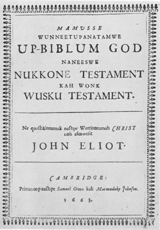 of the Lord's Prayer from the Greek, the first instance in America of such direct translation. But the most interesting of these colonial ventures in scholarship, and also one of the earliest, was the Bible for the Indians brought out in 1661–63 by John Eliot, one of the coeditors of the Bay Psalm Book.