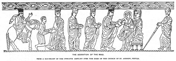 THE ADORATION OF THE MAGI. FROM A BAS-RELIEF OF THE TWELFTH CENTURY OVER THE DOOR OF THE CHURCH OF ST. ANDREW, PISTOJA.