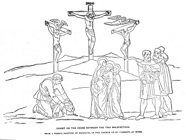 CHRIST ON THE CROSS BETWEEN THE TWO MALEFACTORS. FROM A FRESCO PAINTING BY MASACCIO, IN THE CHURCH OF ST. CLEMENT, AT ROME.