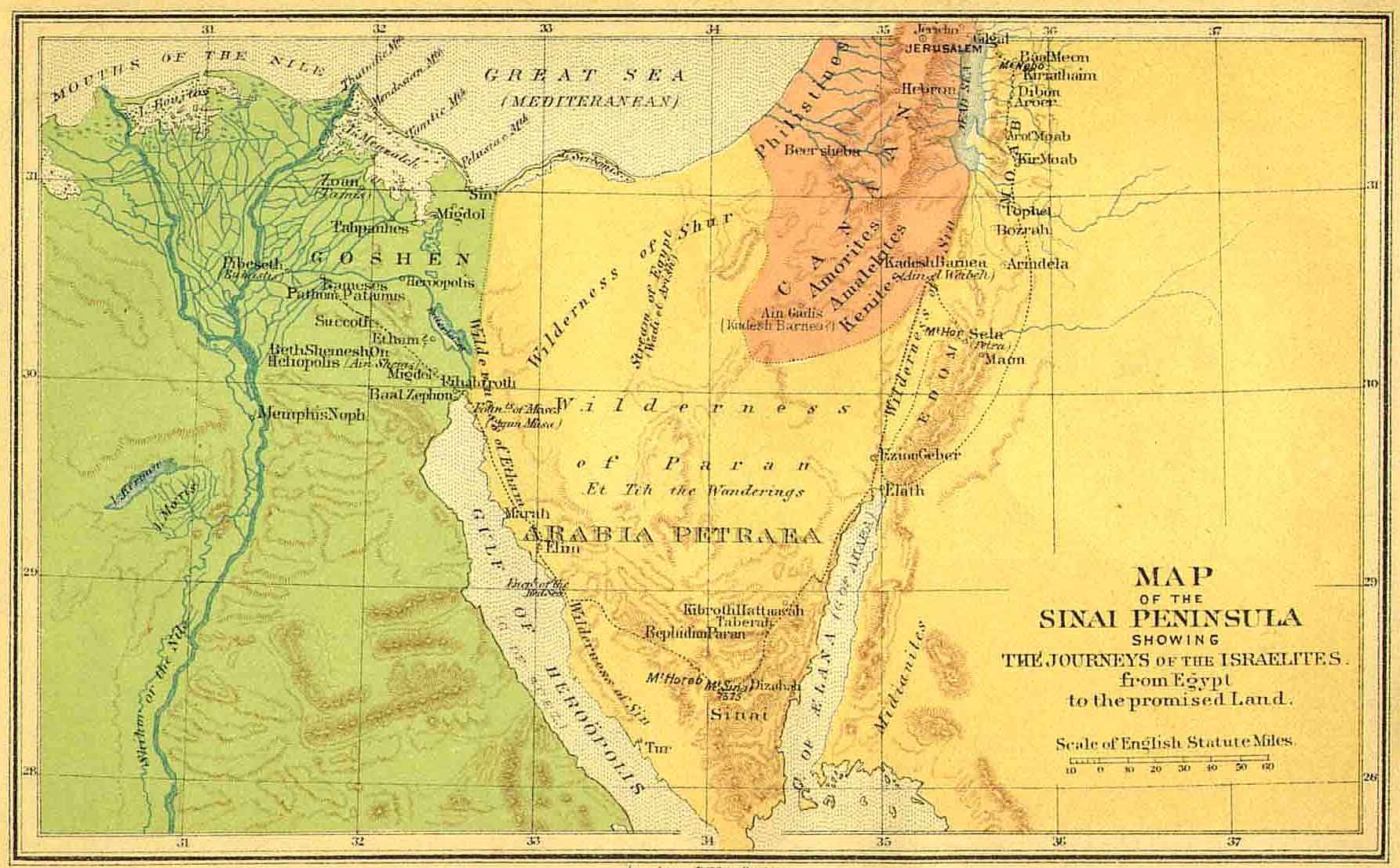 Map of the Sinai Peninsula Showing the Journeys of the Israelites from Egypt to the Promised Land