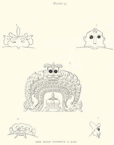 In a chapter about Avalokitishwara, there is one other point of great importance. A stray passage in Crawfurd's "History of the Indian Archipelago" seems to me to throw much light upon him. Mr. Crawfurd says that Siva worship in these regions has quite displaced the worship of Sâkya Muni, and he mentions a very curious fact. In the temples he saw often a monstrous head without a lower jaw. He asked the Munis what this meant, and he was told that it represented Sîva. Now the word "Avalokitiswara" means "Siva looking down." At once I jumped to the conclusion that the single head without the jaw was a simple expedient to accentuate his all-seeing eyes. I was soon able to collect ample evidence that this surmise was correct. I made some sketches, which I reproduce. (Plate 9).
