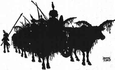 So the demon went further along the road and changed himself into the likeness of a noble gentleman. He called up a beautiful carriage, drawn by milk-white oxen. Then he called ten other demons, dressed them like men and armed them with bows and arrows, swords and shields. Seated in his carriage, followed by the ten demons, he rode back to meet the merchant. He put mud on the carriage wheels, hung water-lilies and wet grasses upon the oxen and the carriage. Then he made the clothes the demons wore and their hair all wet. Drops of water trickled down over their faces just as if they had all come through a stream.